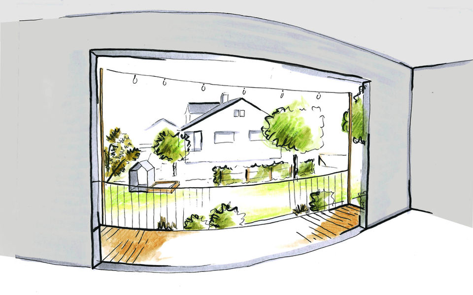 Die neue Terrasse mit Sockelausbildung gliedert sich in den Bestand ein und wird als Verbindendes Element von Garten zu Haus gelesen. Mit kleineren Eingriffen und einem Materialkonezept das sich im gesamten Garten wiederfinden lässt wird der Garten zu einer Einheit. Dennoch bietet er unterschiedliche Nischen und Plätze zum Spielen und verweilen.
